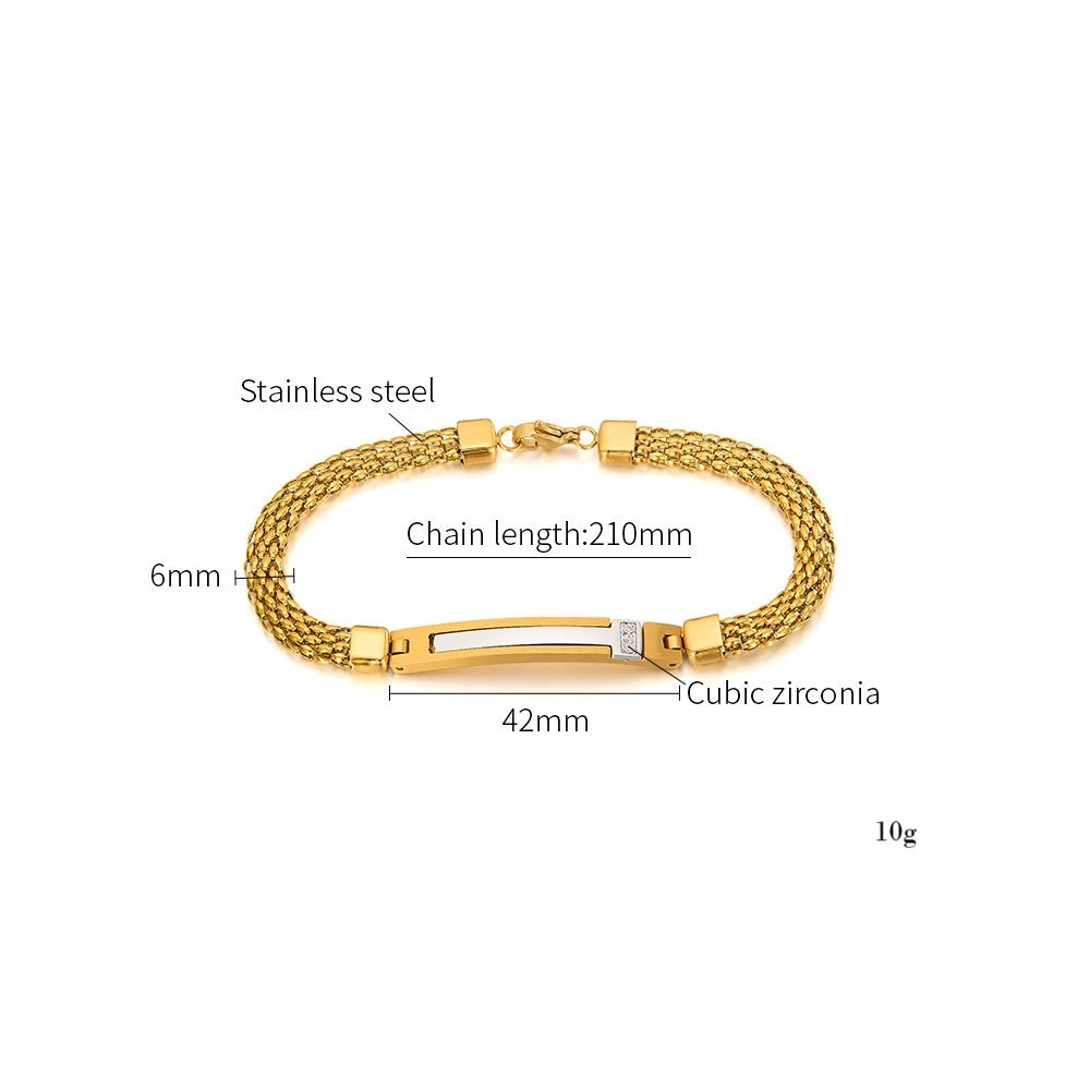Crafted from durable titanium stainless steel with a brilliant gold finish, this men’s bracelet is a bold expression of modern elegance. The sleek white inlay and subtle CZ accent add a refined touch, while the woven mesh chain ensures comfort and flexibility for all-day wear. Designed to resist tarnish and irritation, it's perfect for both casual and formal occasions. The secure lobster clasp offers easy wear and dependable closure. Whether you're elevating your everyday look or searching for a stylish gift, this hypoallergenic bracelet blends timeless design with lasting quality. Ideal for birthdays, anniversaries, or special moments, it’s a powerful accessory for the confident man. Make a statement with strength, style, and sophistication.