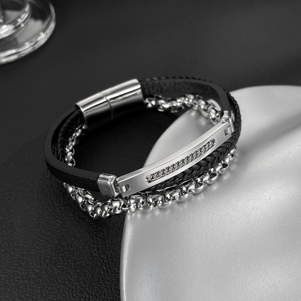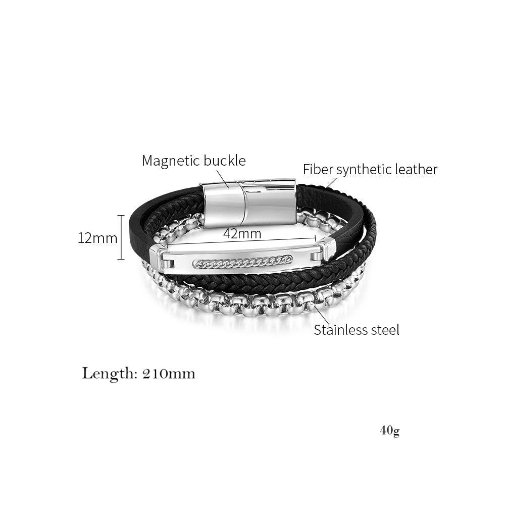 This men’s bracelet blends rugged style with modern elegance, featuring a multi-layer design of braided black leather, polished titanium stainless steel, and a bold silver chain. The durable magnetic clasp offers quick and secure closure, making it easy to wear every day. Comfortable yet eye-catching, it adds a refined edge to both casual and formal outfits. Crafted with high-quality, skin-friendly materials, it resists rust and fading for lasting shine. Whether you're upgrading your own accessories or gifting someone special, this bracelet is a versatile piece that speaks to strength and confidence. Perfect for birthdays, anniversaries, or just because—this is a must-have for any man with bold, refined taste.