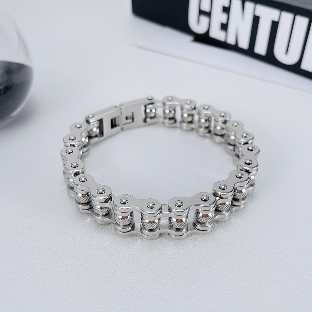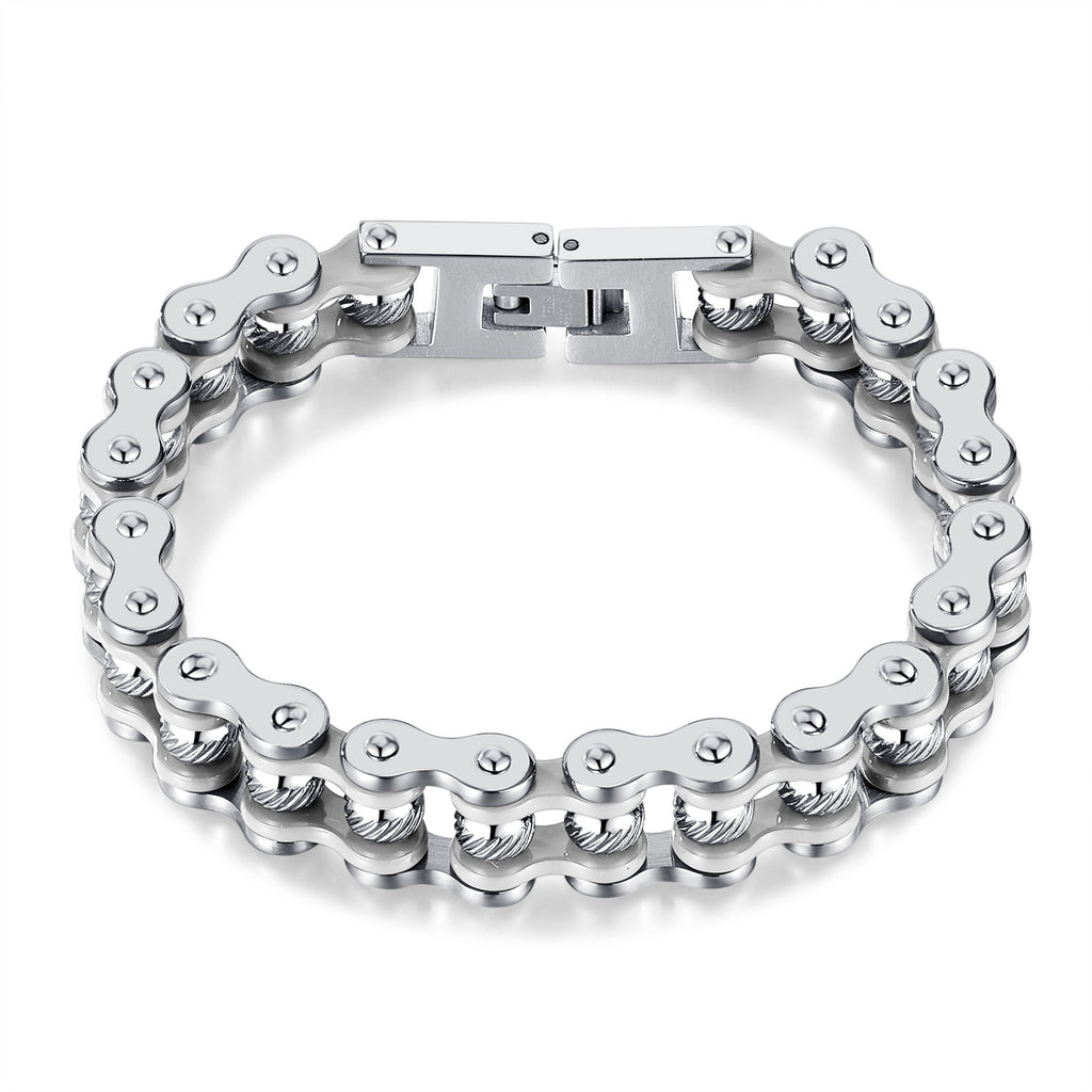 Bring rugged elegance to your style with this men’s harley bike chain bracelet. Featuring a sleek all-silver design, this bracelet combines durability with a bold, masculine look. Crafted from premium titanium stainless steel, it is resistant to rust, tarnish, and everyday wear, making it a long-lasting accessory you can rely on. The polished bike chain links add an industrial, biker-inspired vibe that pairs perfectly with casual, streetwear, or edgy outfits. Smooth edges and a secure clasp ensure comfort and confidence for all-day wear. Whether you’re on the road, at an event, or enhancing your everyday fashion, this bracelet delivers strength and style in one piece. An excellent gift choice for men who value unique and durable jewelry. Sleek silver titanium stainless steel bike chain bracelet for men. Durable, stylish, and perfect for bikers or bold fashion enthusiasts.