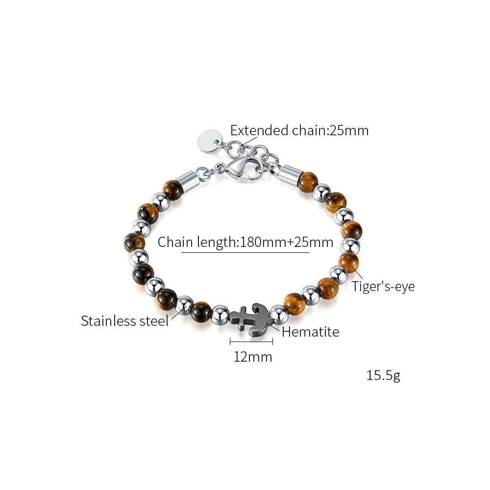 Men’s Tiger Eye Bead Bracelet with Anchor Charm – Stainless Steel Adjustable Clasp, Durable Fashion Jewelry for Men