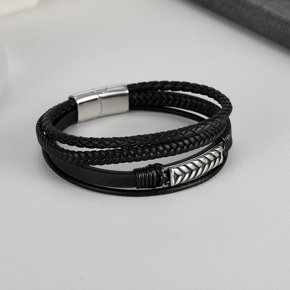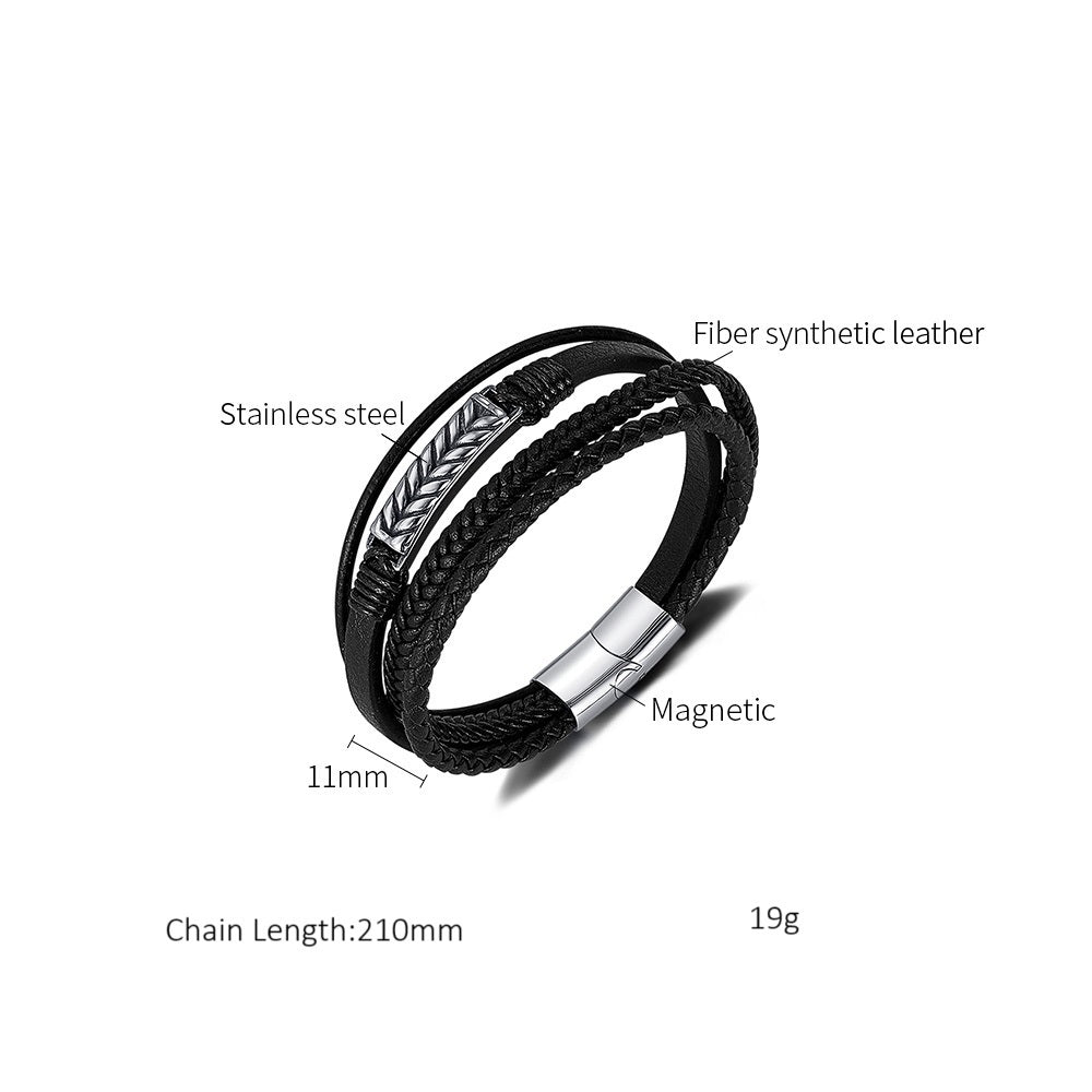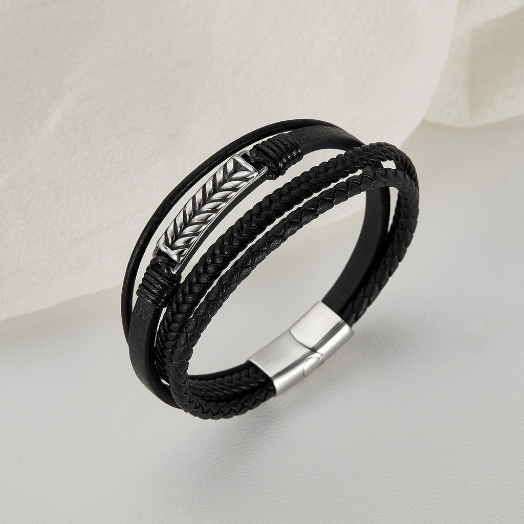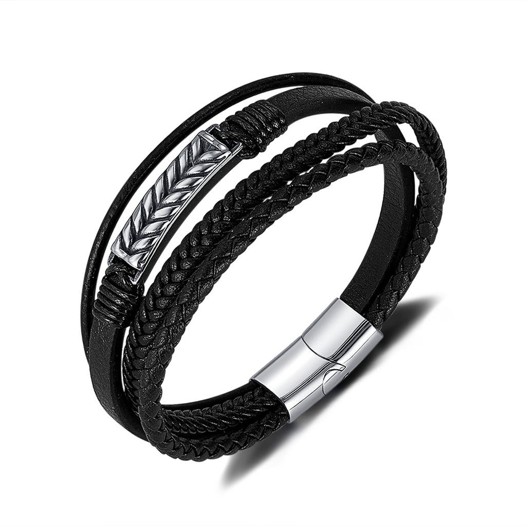Men’s Braided Leather Bracelet – Multi-Strand Black Leather with Stainless Steel Accent, Magnetic Clasp, Durable Fashion Jewelry for Men