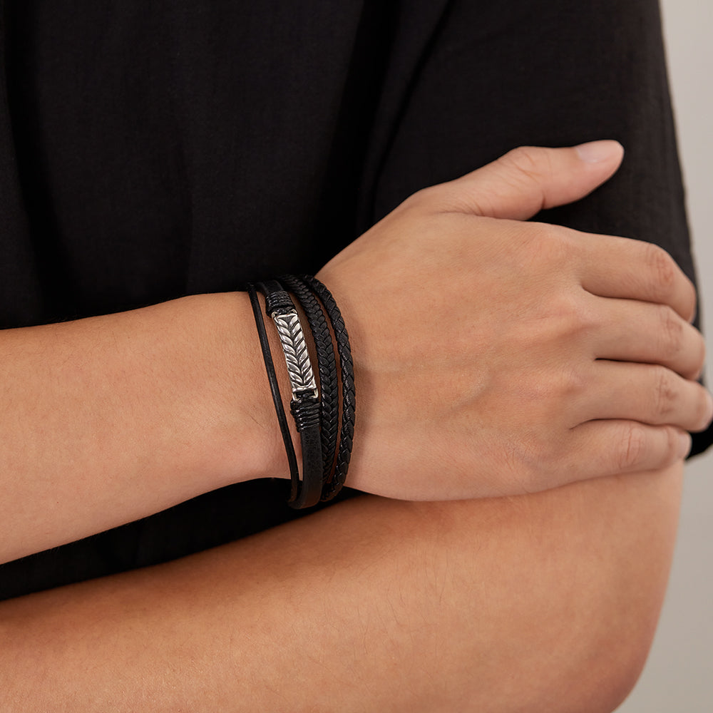 Upgrade your style with this men’s braided leather bracelet, featuring layered black leather bands and a sleek stainless steel accent. Designed with both braided and smooth textures, it delivers a bold yet modern masculine look. The durable stainless steel magnetic clasp ensures easy wear and a secure fit, making it practical for everyday use. Lightweight and comfortable, this bracelet pairs perfectly with casual outfits, office wear, or formal attire. Its versatile multi-strand design makes it a must-have accessory for men who value strength and sophistication. An excellent gift for birthdays, anniversaries, Father’s Day, Valentine’s Day, or Christmas, this bracelet arrives packaged and ready to impress. Add timeless style and rugged elegance to your wardrobe with this men’s leather bracelet.