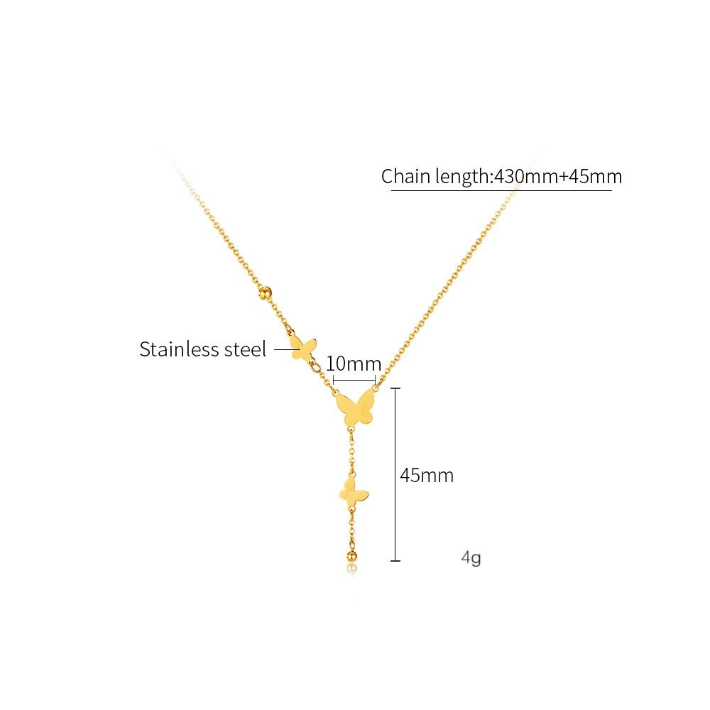 Enhance your jewelry collection with this elegant gold Y-necklace, featuring dainty butterfly charms that cascade into a delicate drop pendant finished with a single pearl. This sophisticated piece is perfect for adding a subtle yet stylish touch to any ensemble, making it an ideal accessory for both daytime elegance and evening glamour.