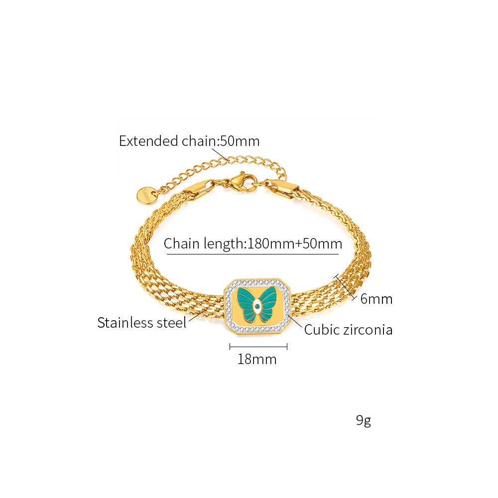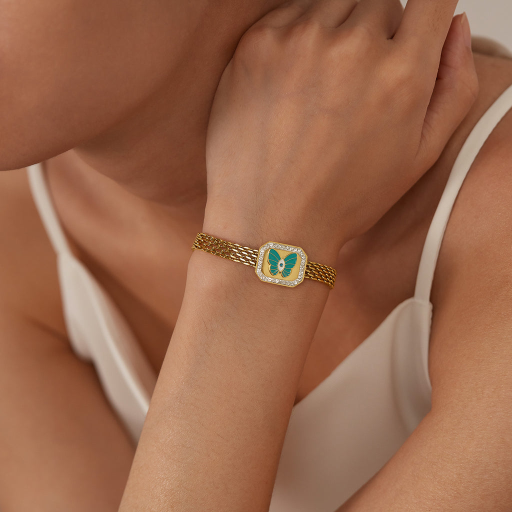 This elegant women’s titanium stainless steel bracelet features a stunning butterfly charm with vibrant teal enamel and crystal accents. The butterfly design adds a touch of nature-inspired beauty, making it a perfect accessory for both casual and formal occasions. Crafted from high-quality titanium stainless steel, it is durable, hypoallergenic, and resistant to tarnishing. The adjustable chain ensures a comfortable fit for most wrist sizes, offering all-day wearability. Whether you're treating yourself or searching for a thoughtful gift, this bracelet makes an ideal present for birthdays, anniversaries, or special celebrations. With its timeless elegance and versatile design, it’s sure to become a cherished piece in any jewelry collection.
