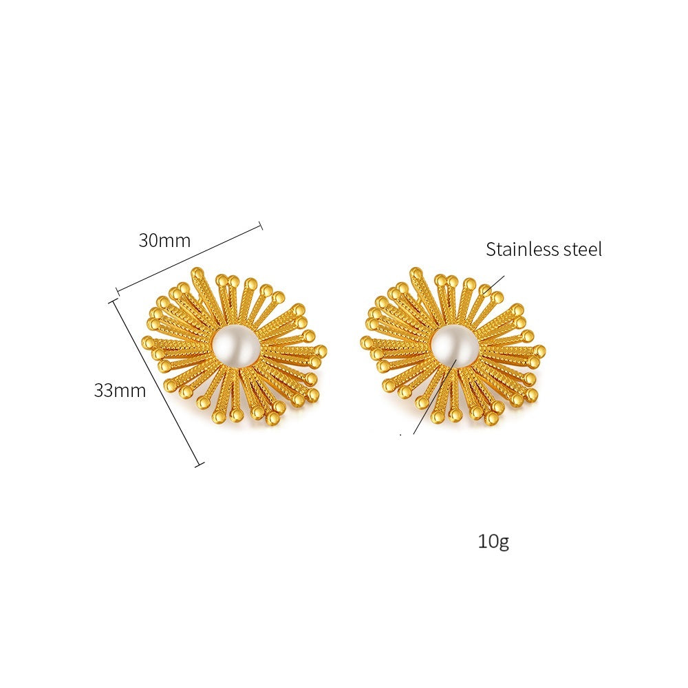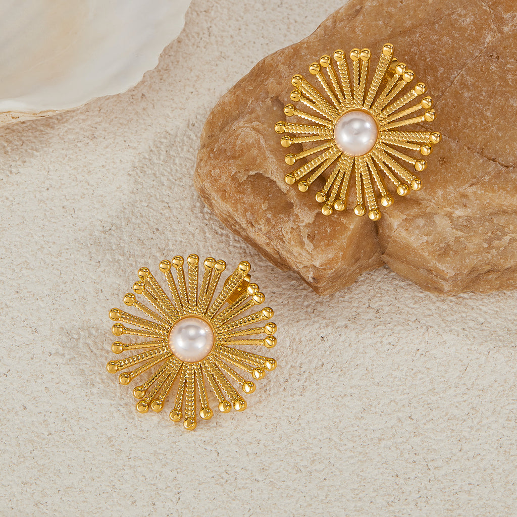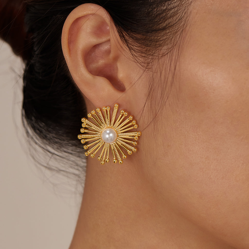 Women’s Gold Sunburst Pearl Earrings – Elegant Statement Stud Earrings with Simulated Pearl Center, Fashion Jewelry for Women and Girls