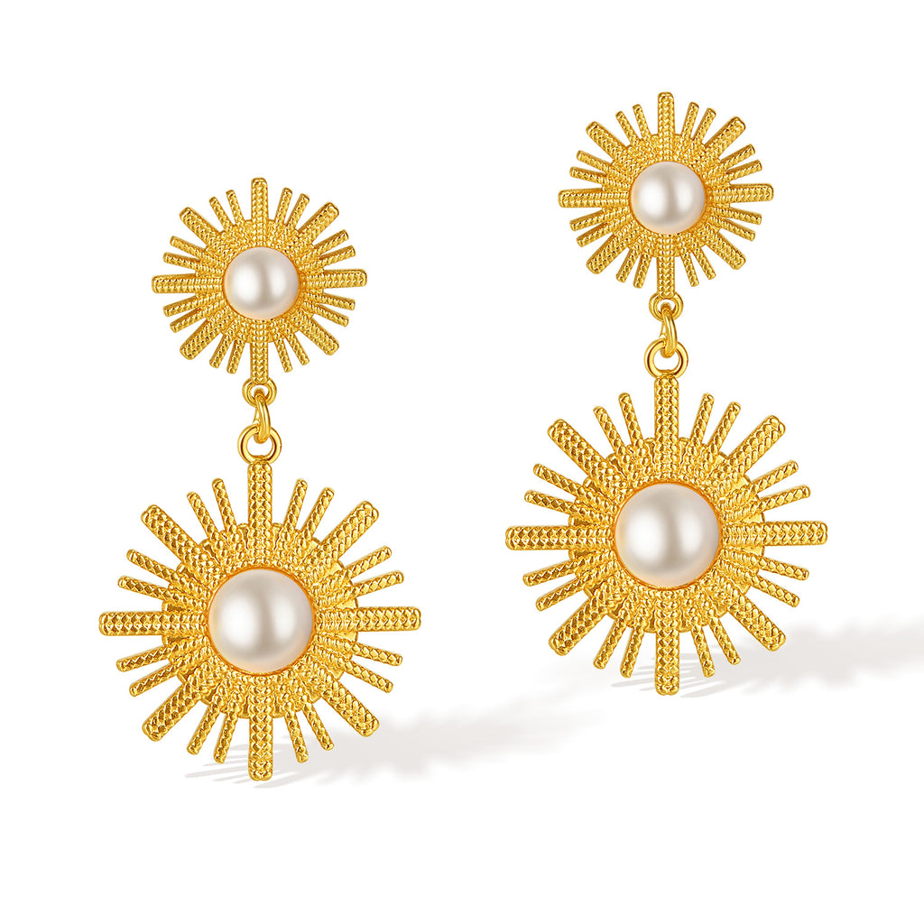 Women’s Gold Sunburst Pearl Drop Earrings – Elegant Double Sun Statement Earrings with Simulated Pearl, Fashion Jewelry for Women and Girls