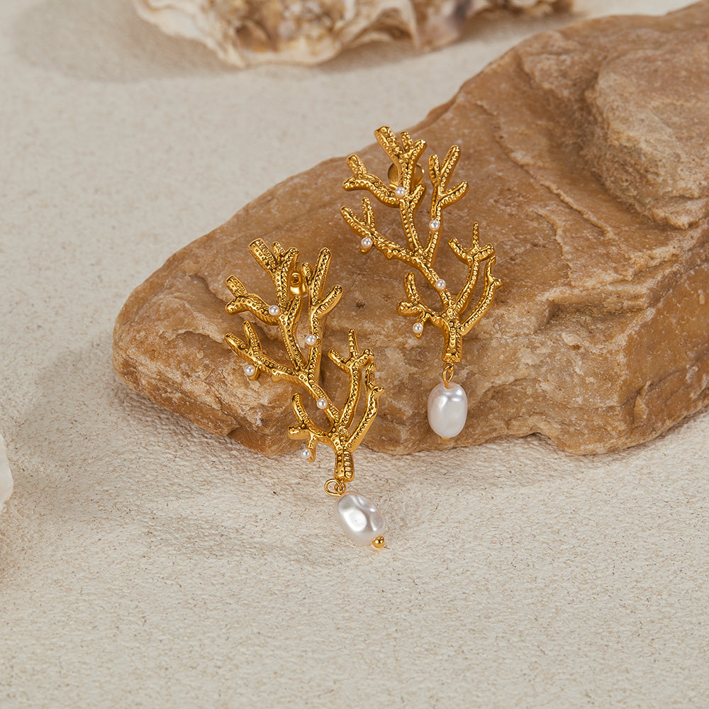 Women’s Gold Coral Pearl Drop Earrings – Ocean-Inspired Statement Earrings with Simulated Pearls, Elegant Dangle Jewelry for Women and Girls