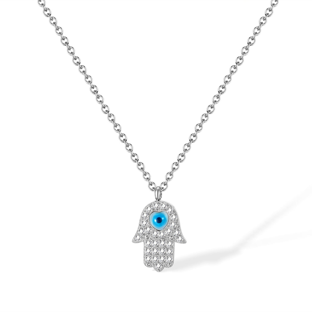 Women’s Evil Eye Hamsa Hand Pendant Necklace – Sterling Silver Plated Chain with Blue Eye Charm – Protective Jewelry Gift for Women